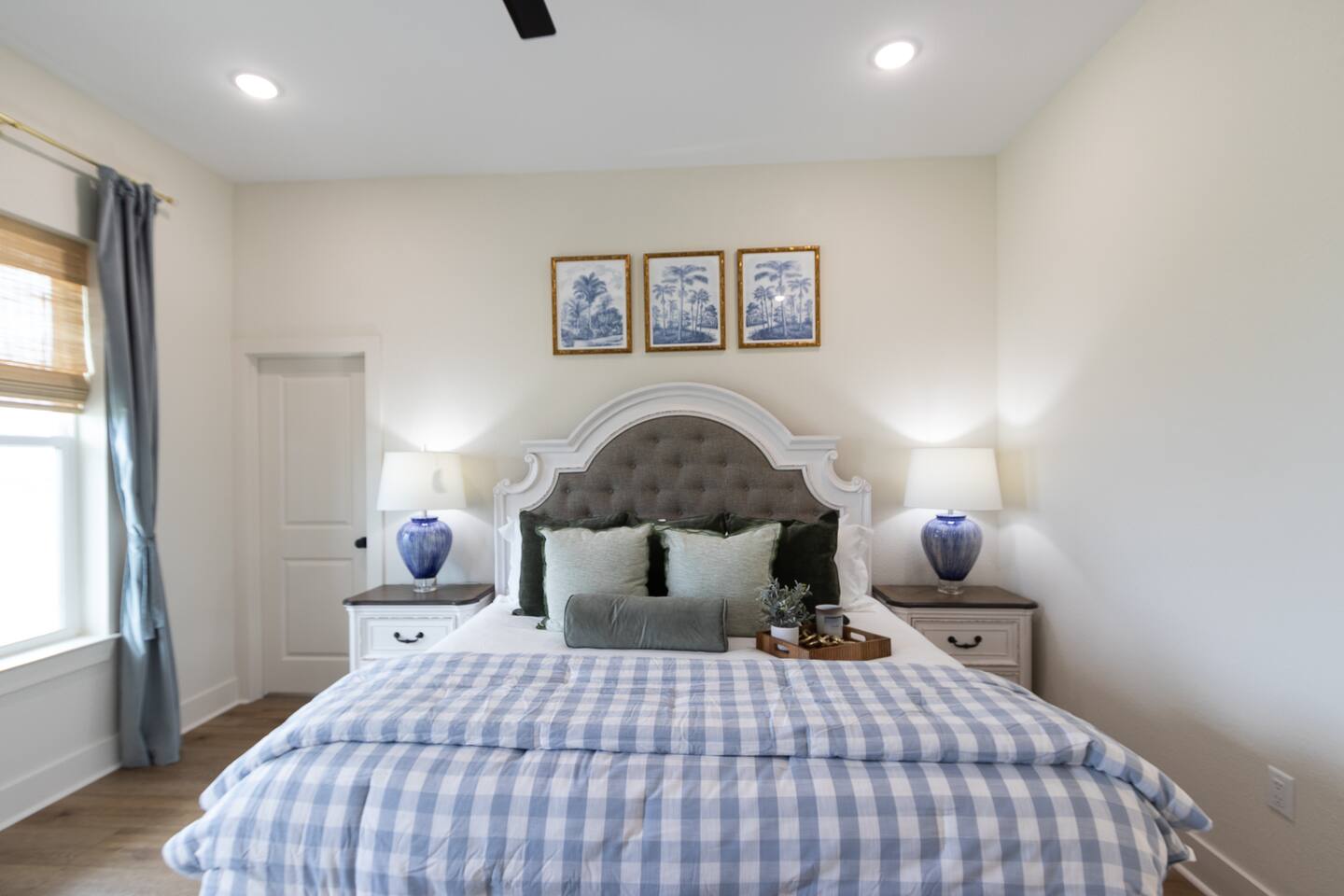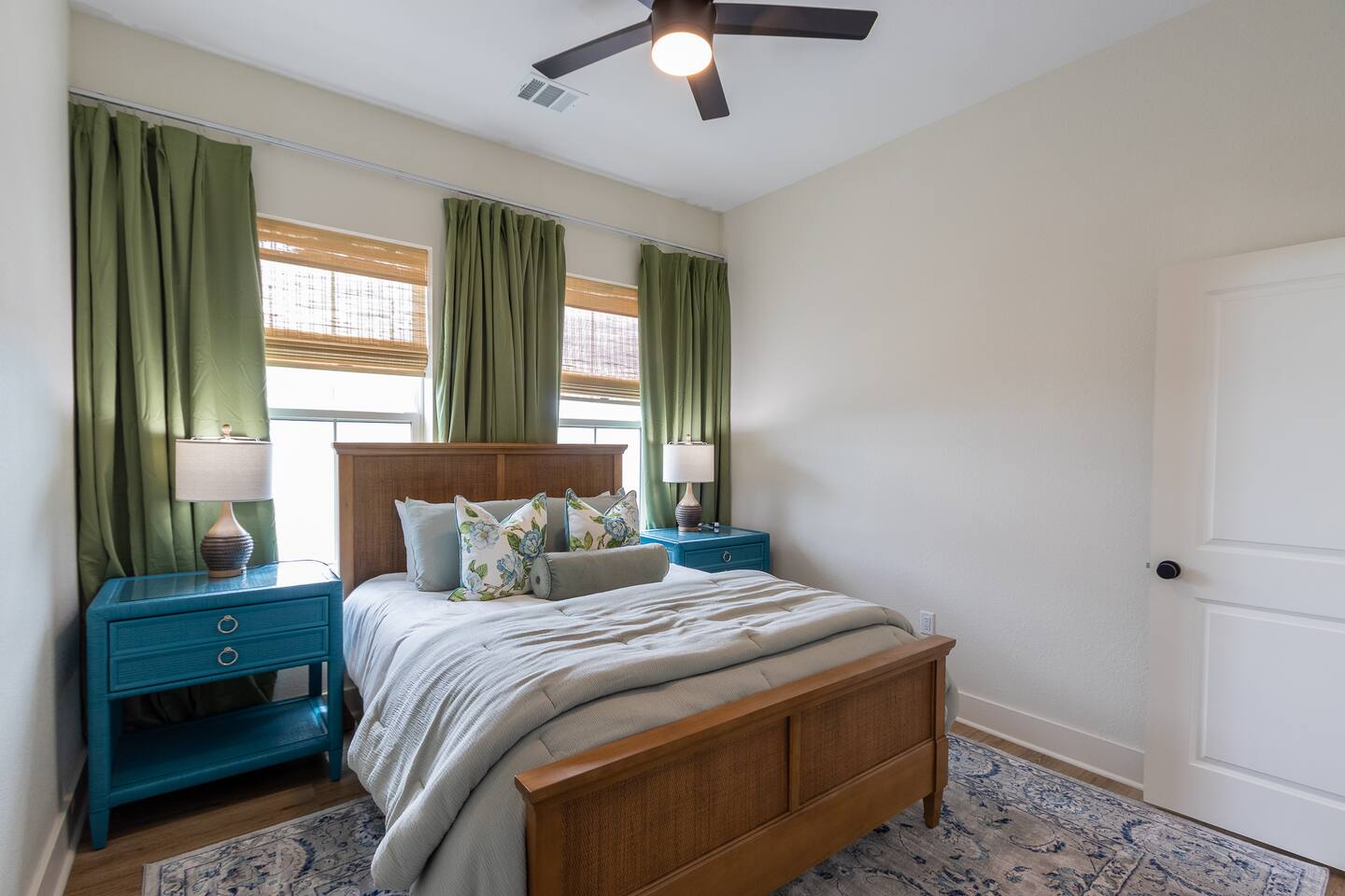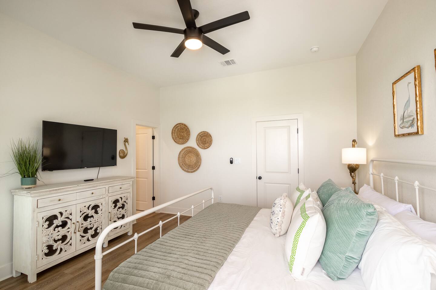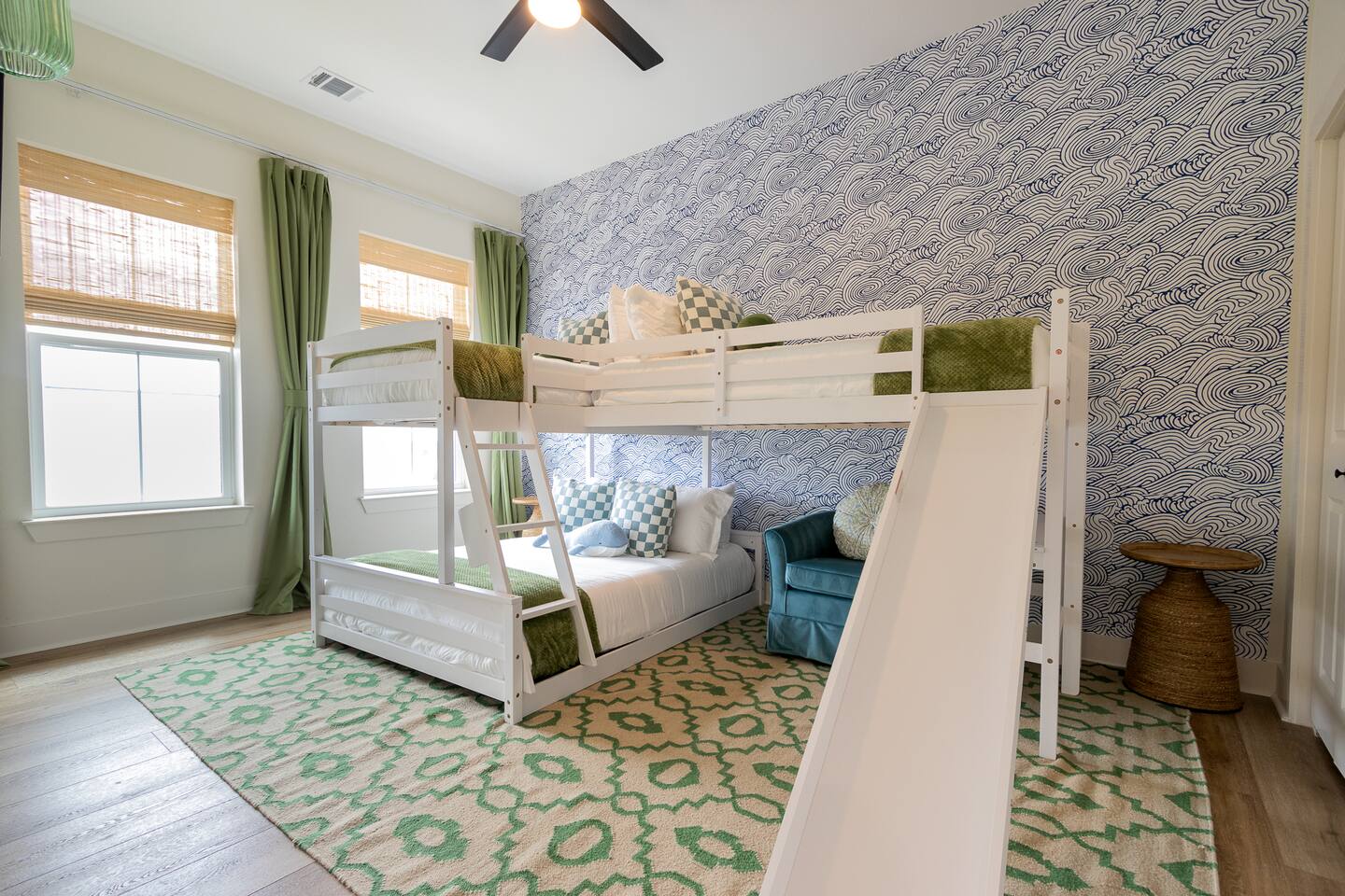 The home has 4 bedrooms and 3.5 bathrooms. It has a primary bedroom with a king bed and private bath on the first floor with private balcony.. Upstairs there are 3 bedrooms. One is a primary bedroom with a king, private balcony and private bath. The "guest" bedroom has a queen bed and a bathroom shared with the "kids" room. The kids room has a bunk bed set up with a slide down. There is also a pull out couch in the living room that can sleep 2.