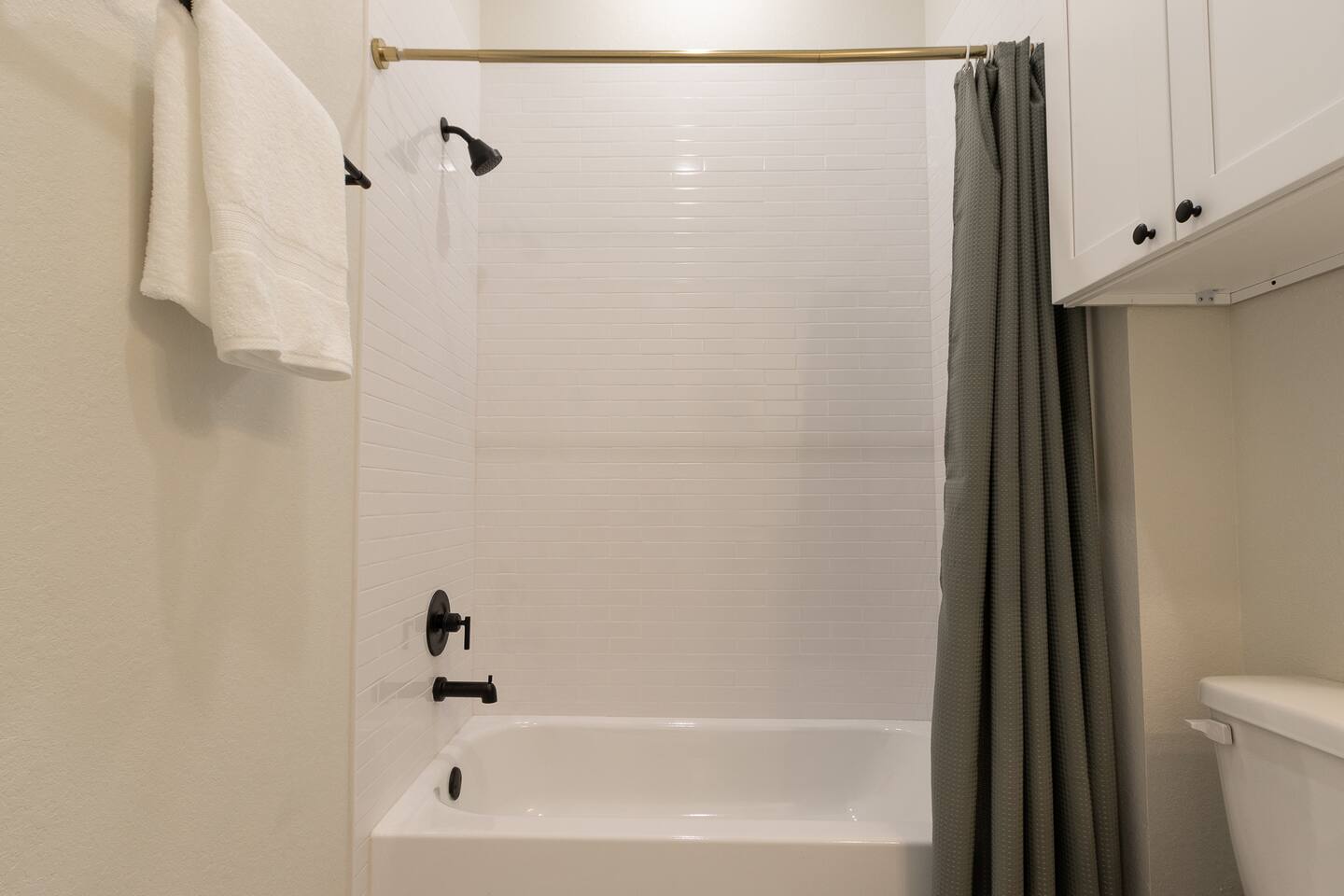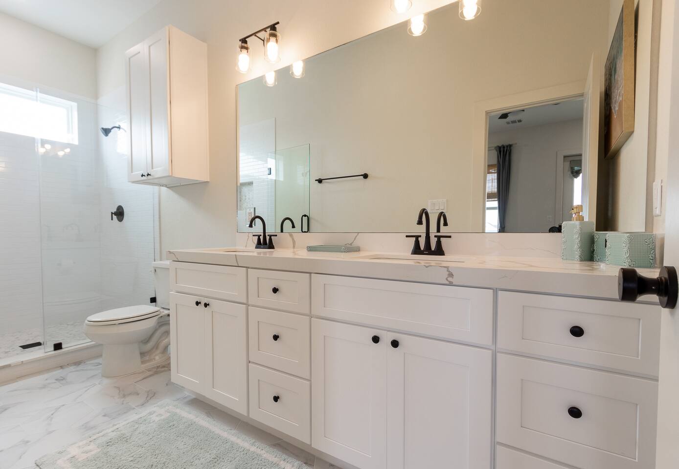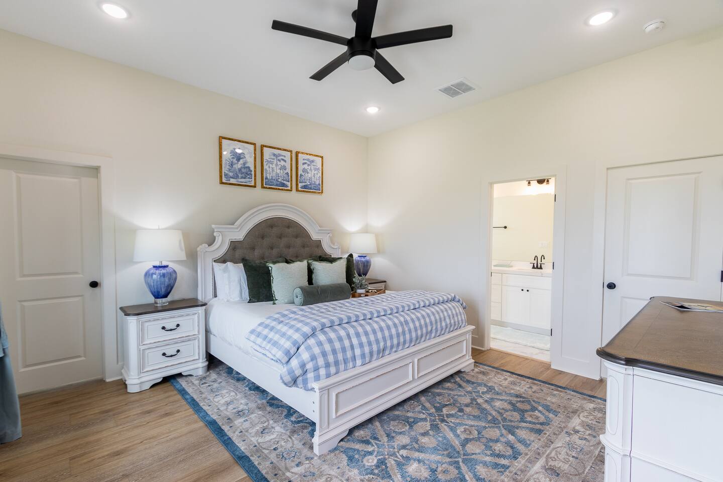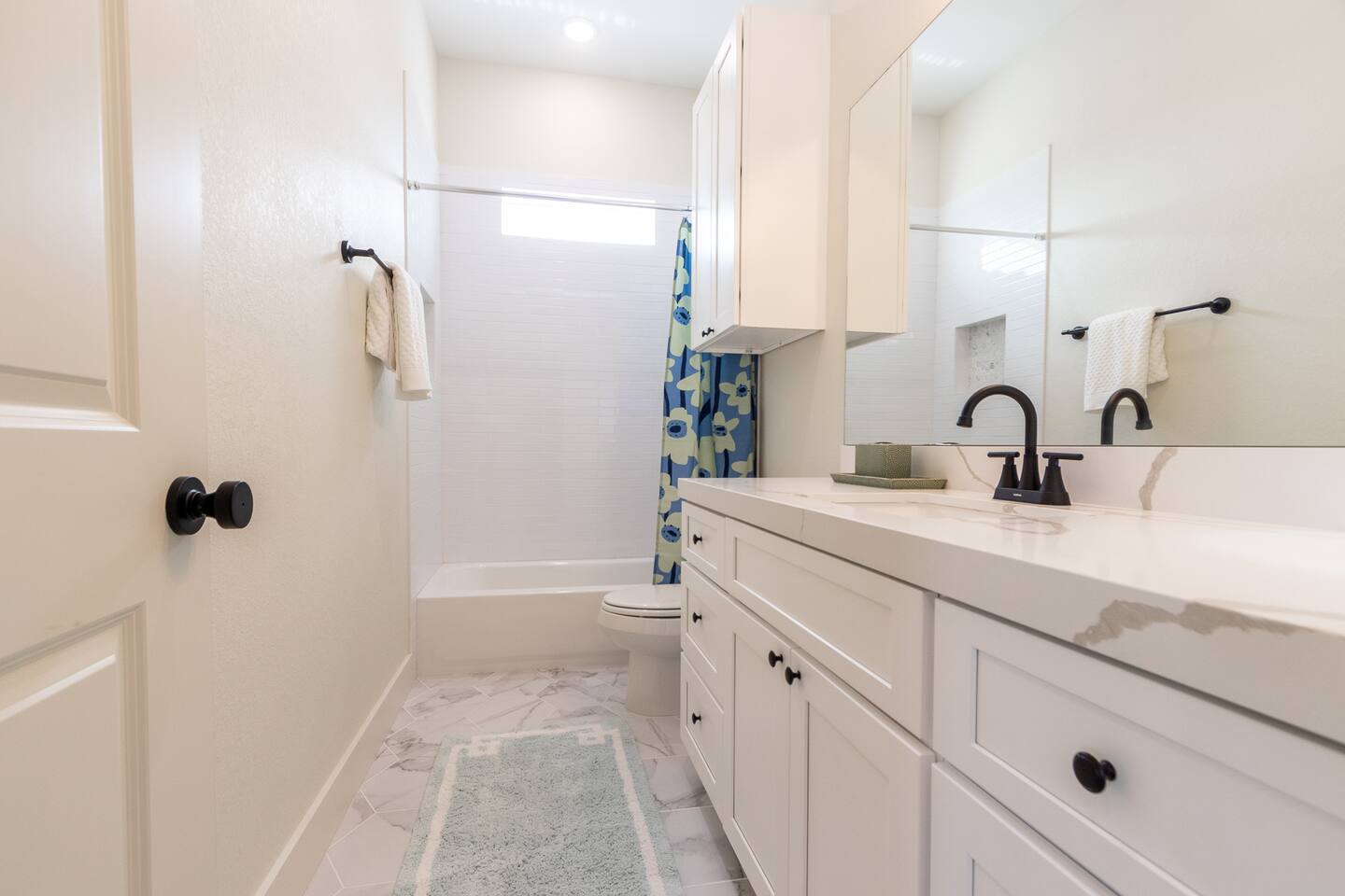 The home has 4 bedrooms and 3.5 bathrooms. It has a primary bedroom with a king bed and private bath on the first floor with private balcony.. Upstairs there are 3 bedrooms. One is a primary bedroom with a king, private balcony and private bath. The "guest" bedroom has a queen bed and a bathroom shared with the "kids" room. The kids room has a bunk bed set up with a slide down. There is also a pull out couch in the living room that can sleep 2.