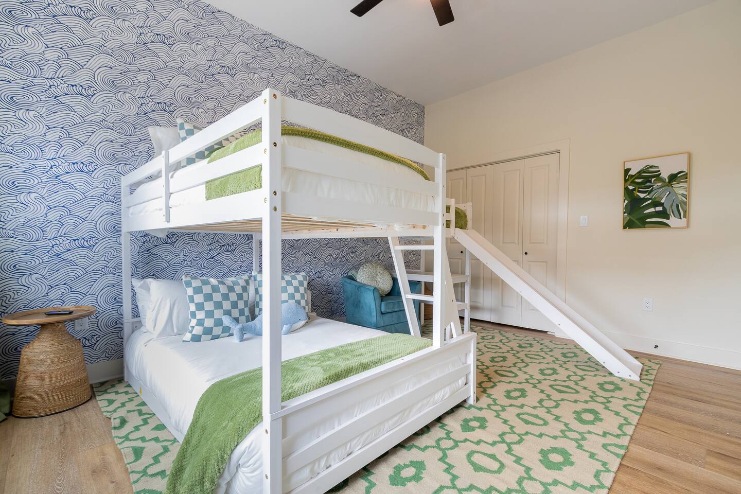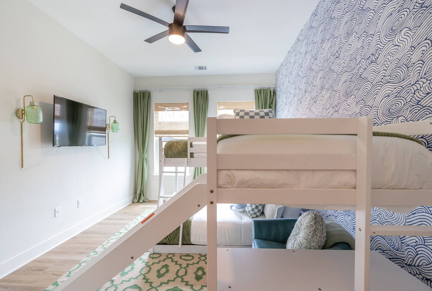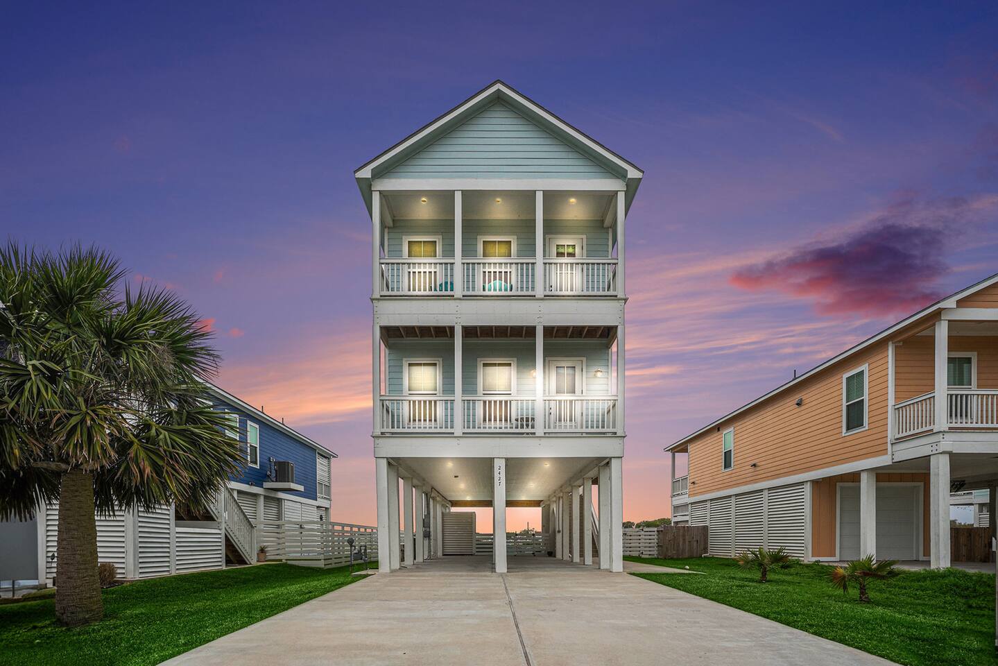 "Slides and Tides" is a BRAND NEW build in Galveston Tx. It features 4 bedrooms, and 3.5 beautiful bathrooms. Relax and enjoy your family vacation in this professionally decorated beach themed house. The parents will enjoy the large pool with a waterfall and bubblers w/ tanning ledge. Pool completion by 3/15/24. The kids will love the bunk room w/slide. The golfers will enjoy the location near the Moody gardens golf course and putting green. The 3 decks have views of the beach and bay